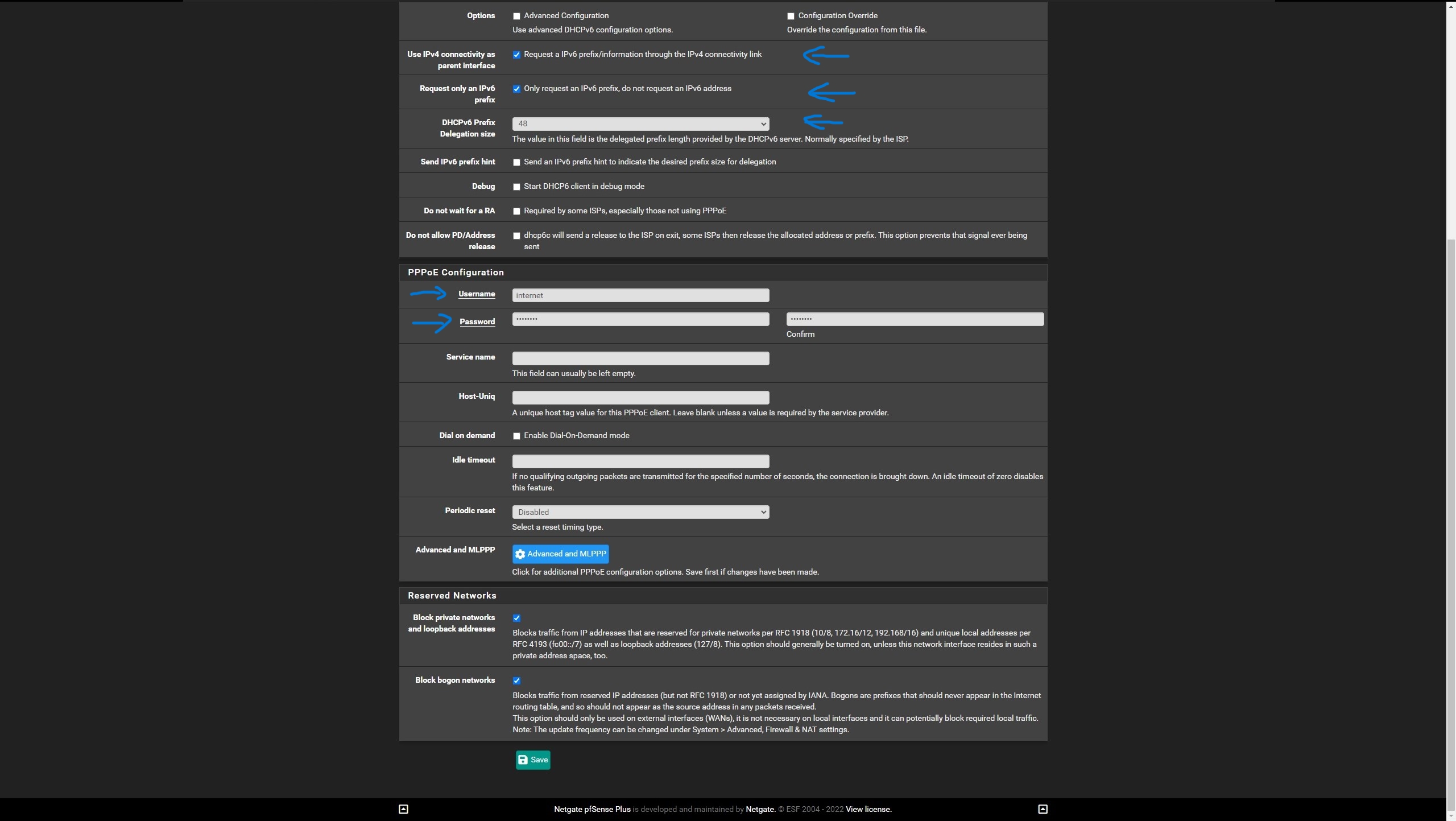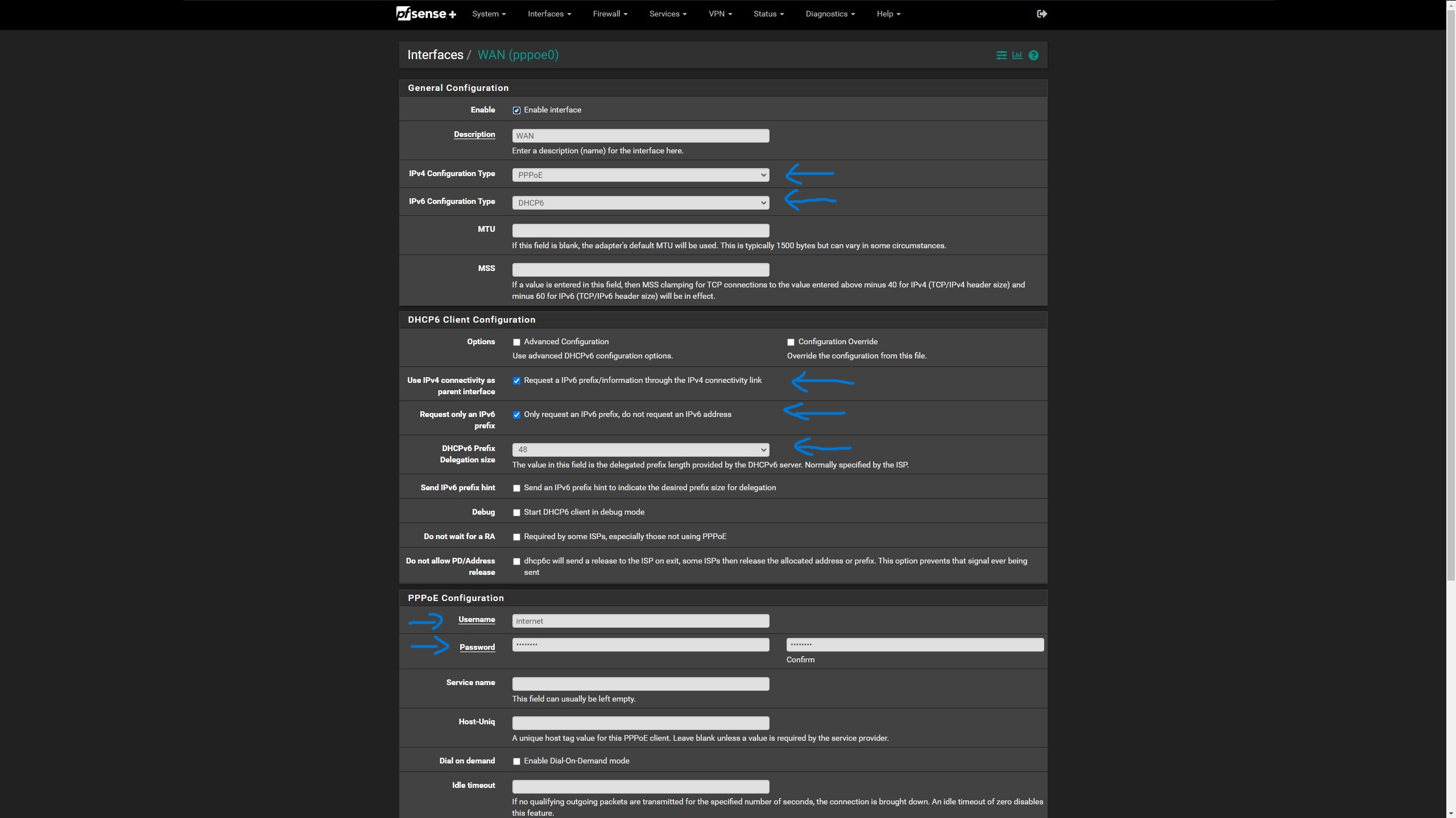 Ga naar Interfaces WAN en verander IPv4 van DHCP naar PPPoE, mocht je ook DHCPv6 willen kun je deze daar ook aanzetten.