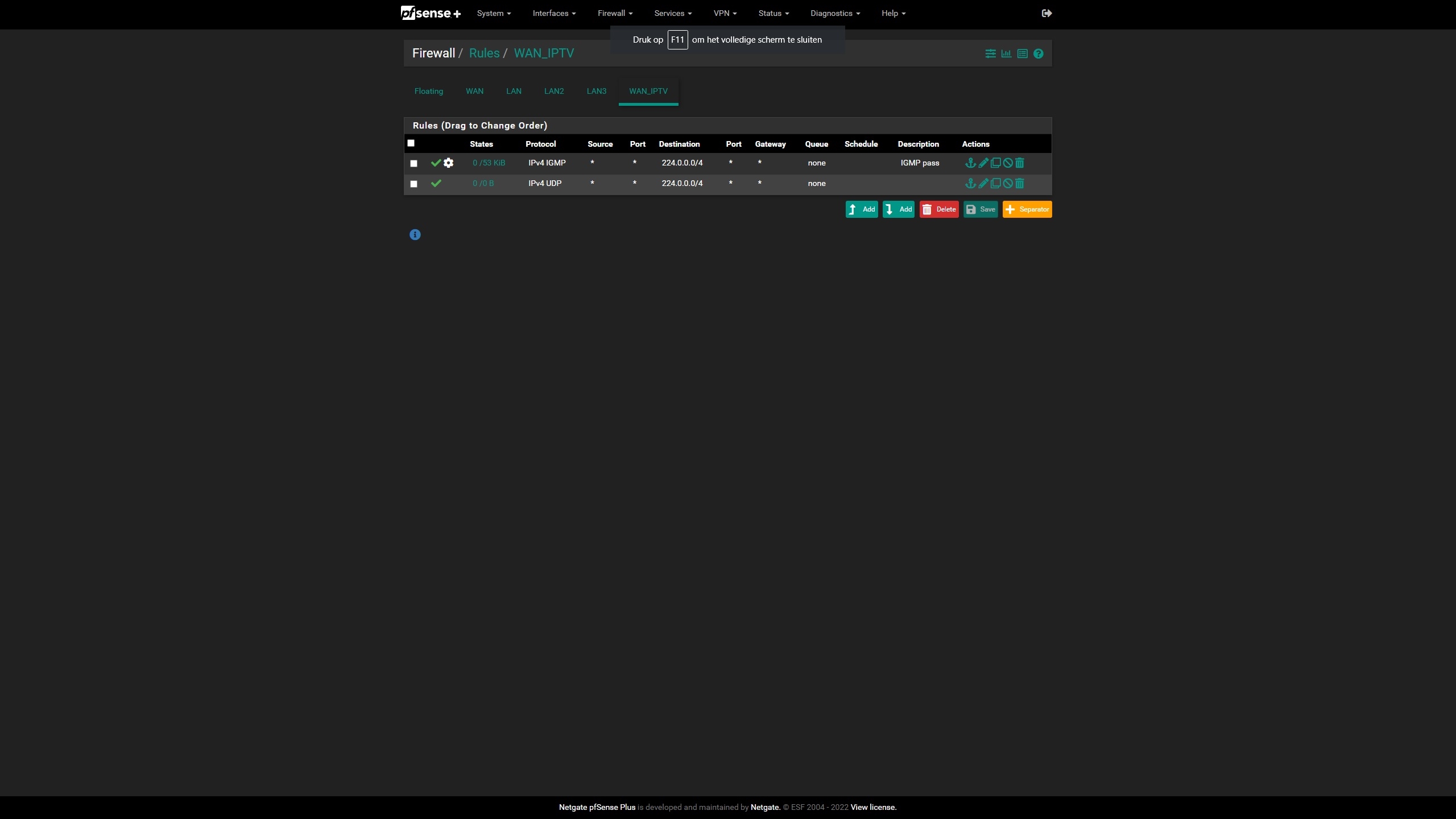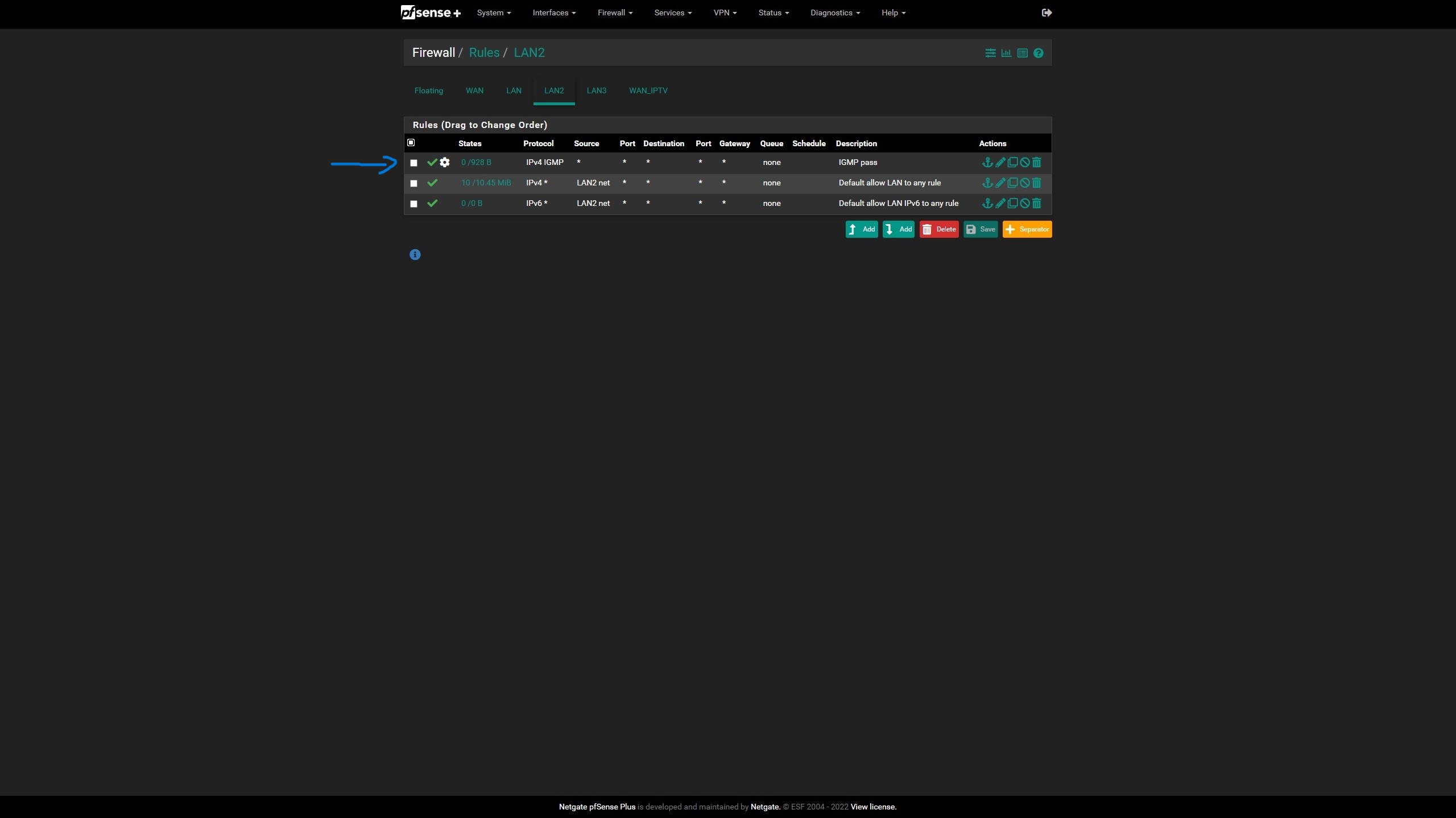 Hier moet 1 regel worden toegevoegd. Ga naar firewall - Rules - lan2