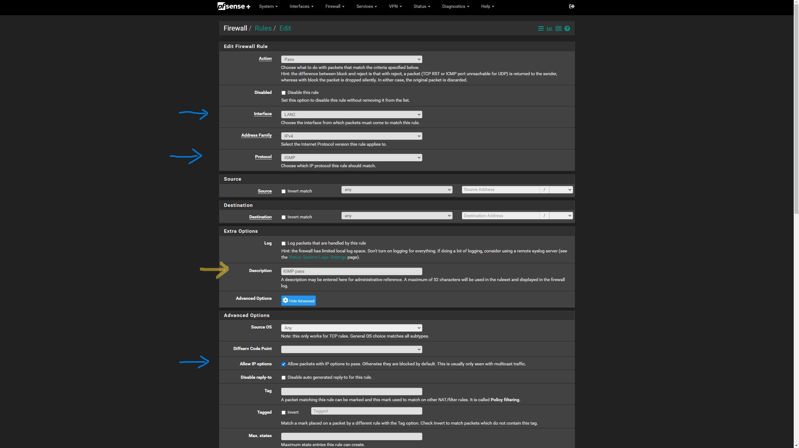 regel 1 Alles onder Allow ip options is default (blauwe markering)