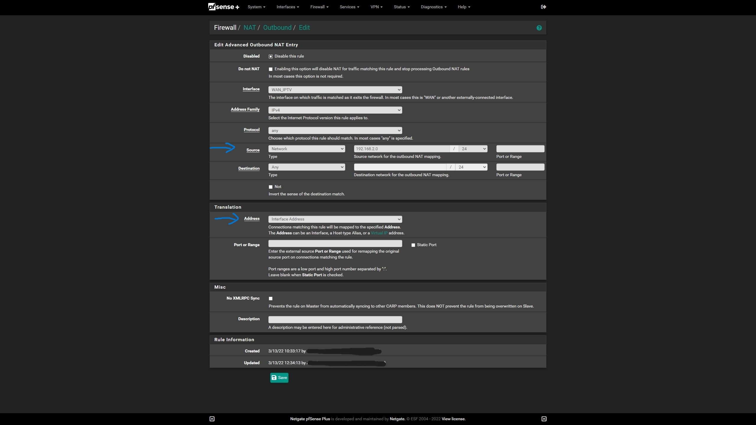Ga naar Firewall - NAT - Outbound zet de mode op Hybrid en voeg daar 2 regels toe