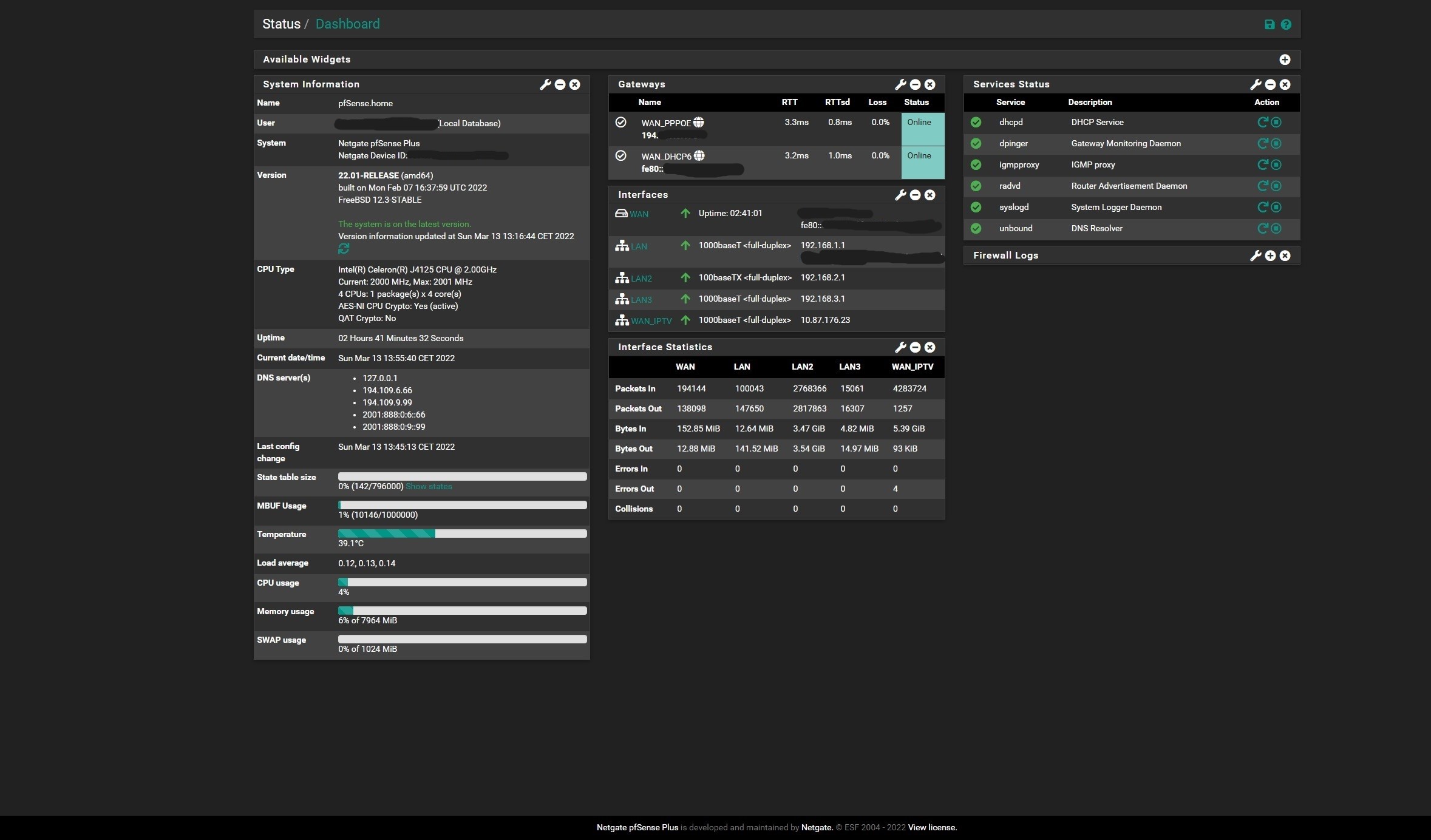 Na het instellen van de 2 wan interfaces zou je nu op de Begin scherm van Opnsense moeten kunnen zien of je een verbinding hebt.